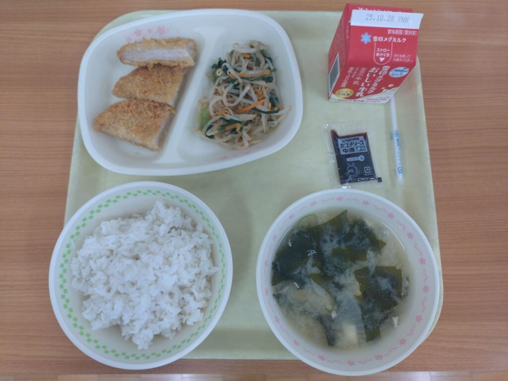 今日の給食は、ごはん、みそ汁、とんかつ、じゃこ和えです。