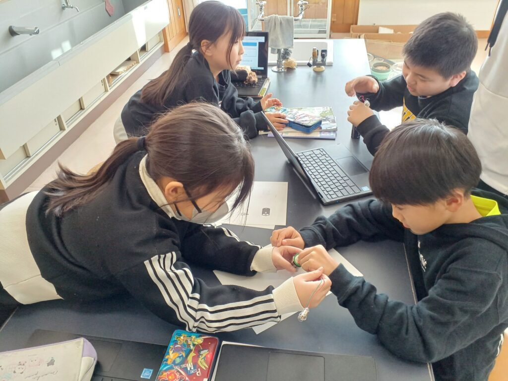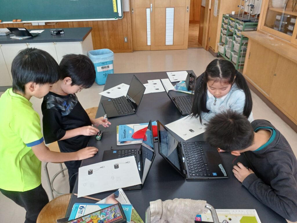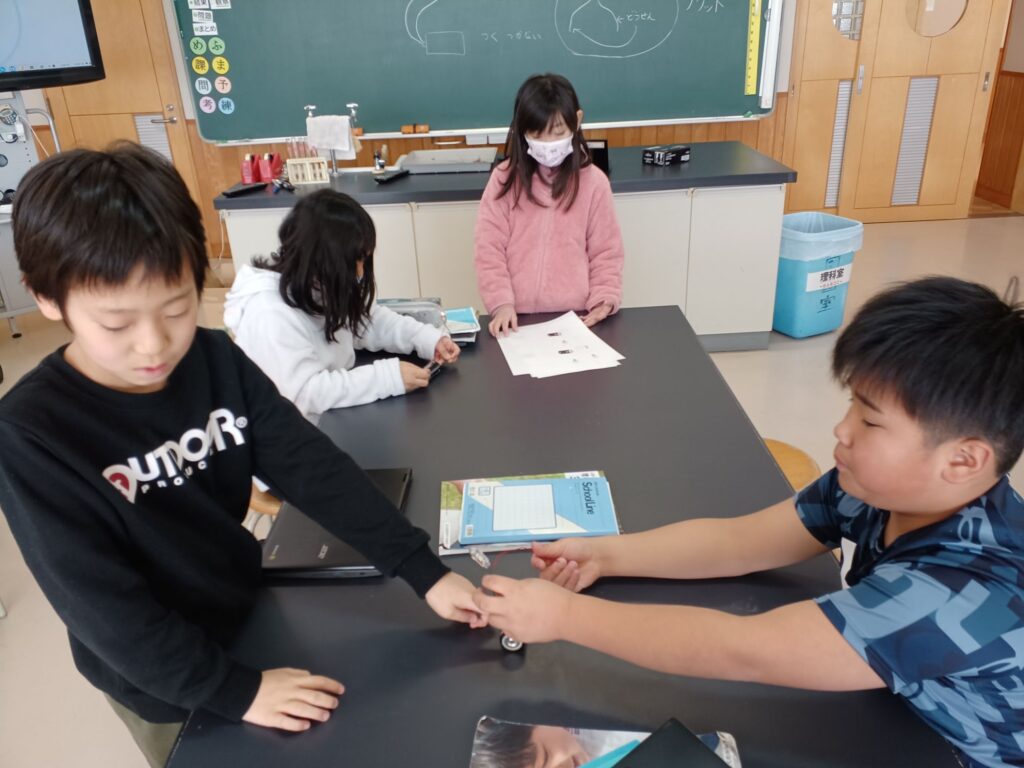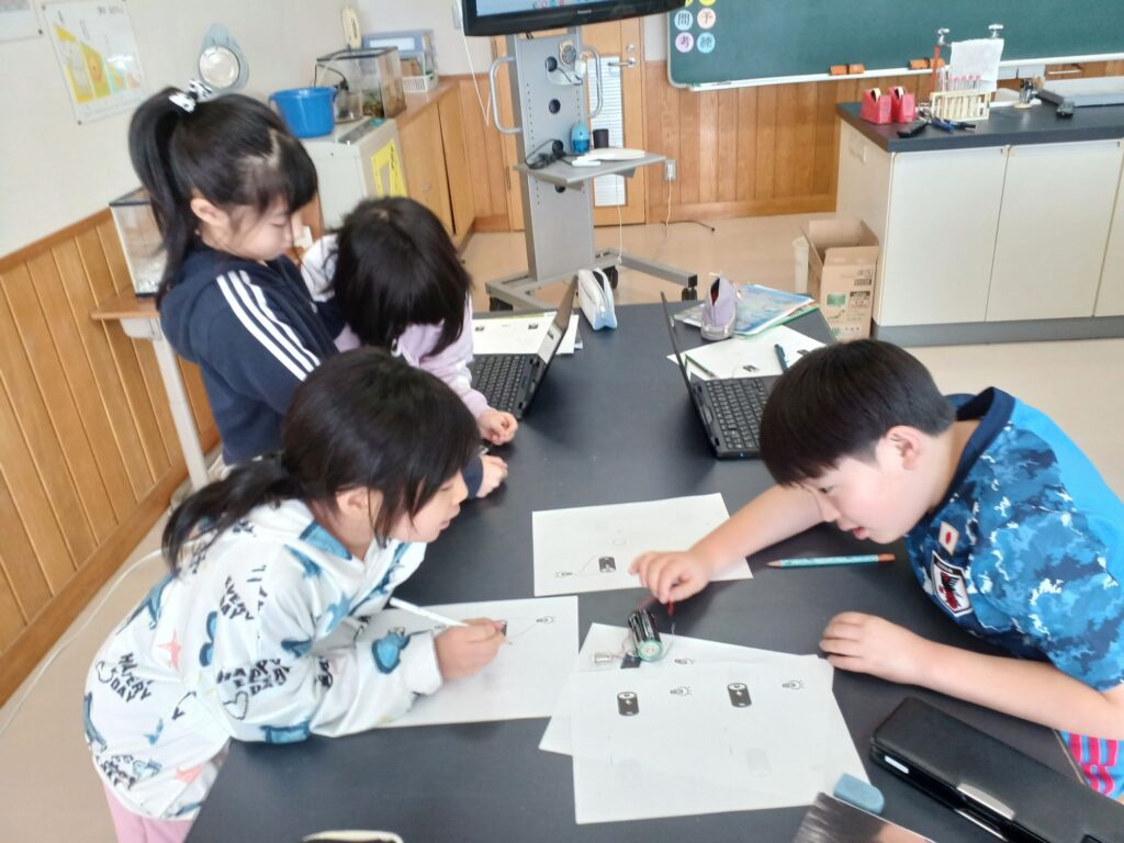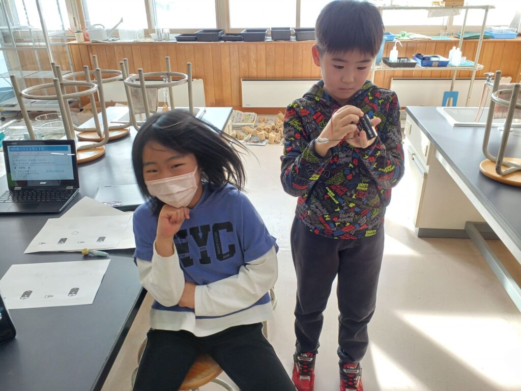 電池と豆電球とソケットを使ってどうつなぐと豆電球にあかりがつくか実験をしました。