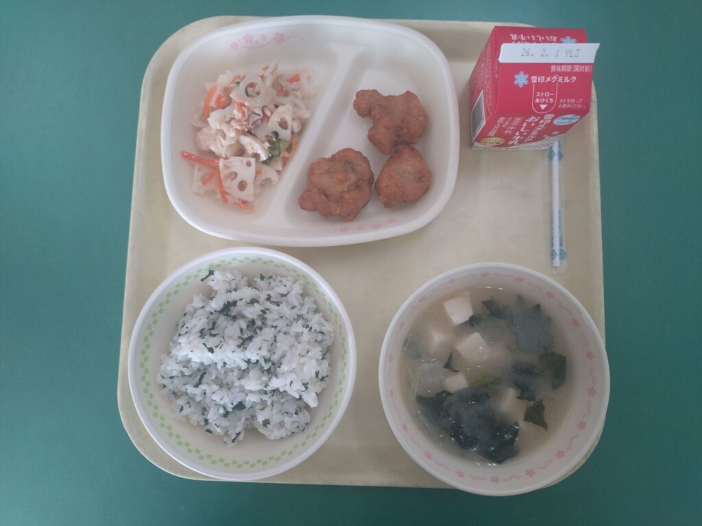 今日の給食は、わかめごはん、みそ汁、からあげ、レンコンサラダです。