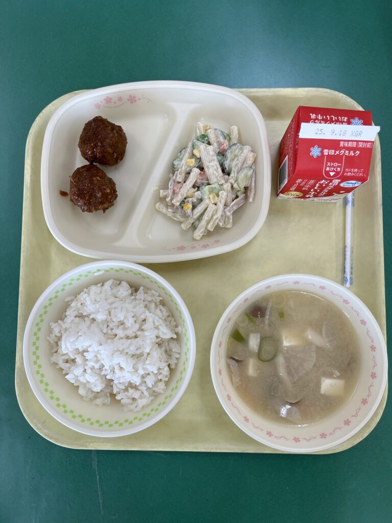 本日のメニューは、ごはん、豚汁、肉団子みそだれ、マカロニサラダ、牛乳です。