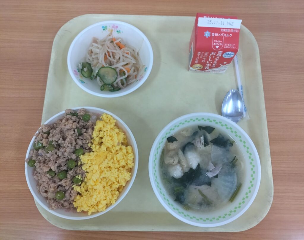 今日の給食は、二色丼、団子汁、もやし和えです。