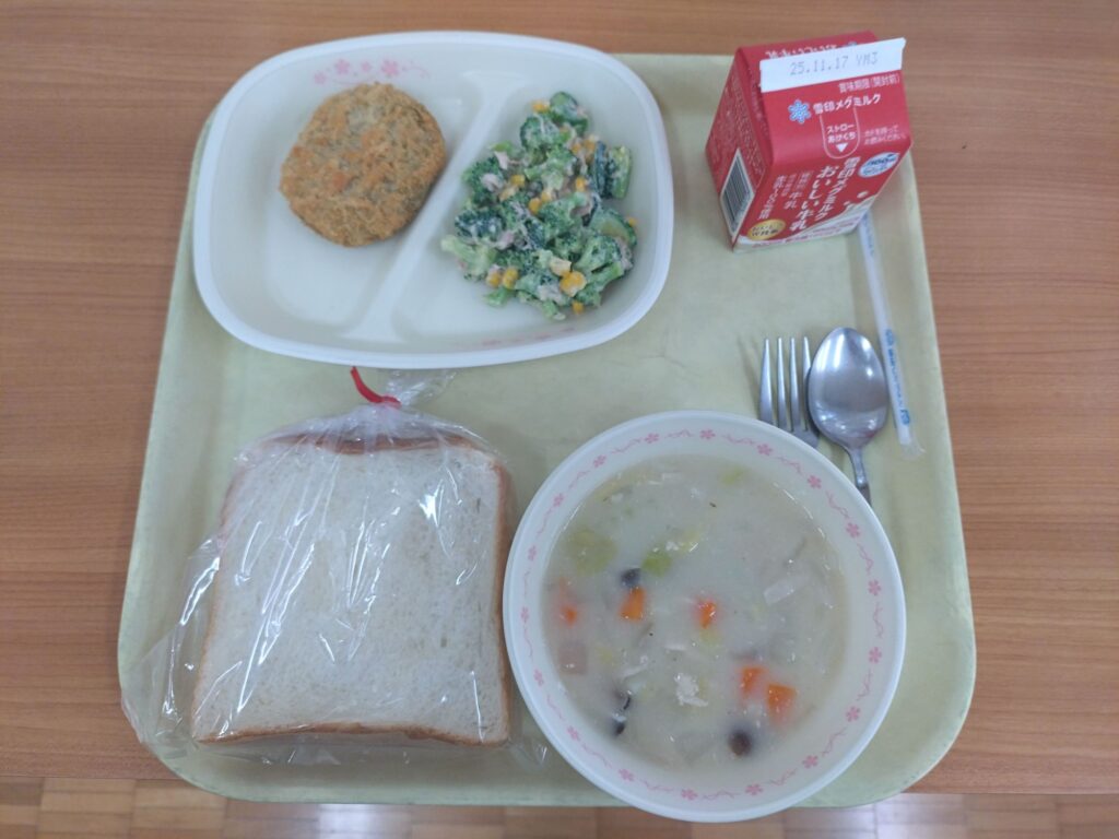 今日の給食は、パン、シチュー、かぼちゃコロッケ、ブロッコリサラダです。