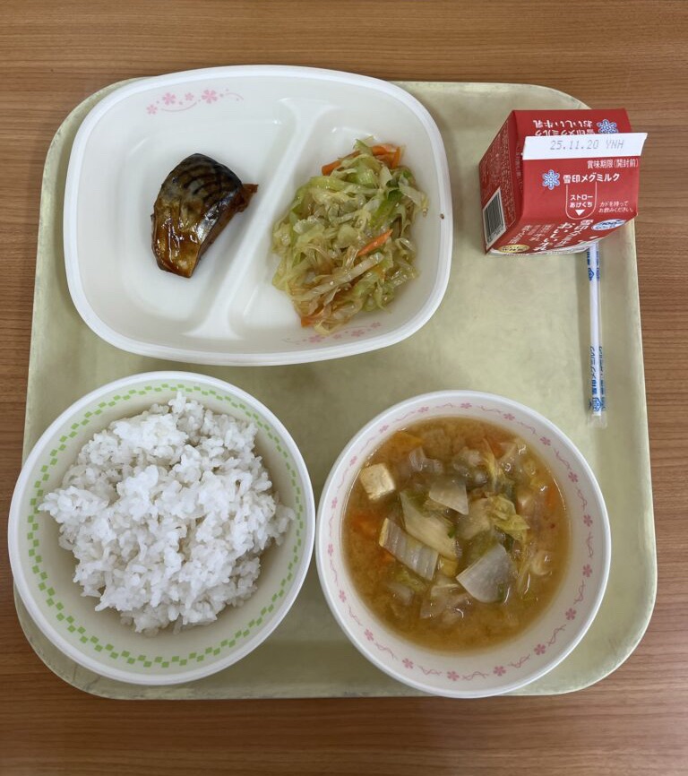 今日のメニューは、ごはん、キムチ汁、サバカレー風味、春雨和え、牛乳です。