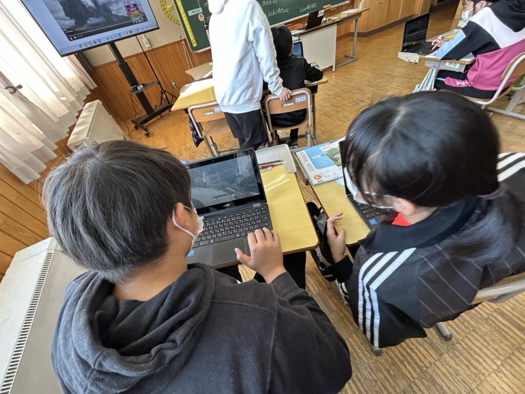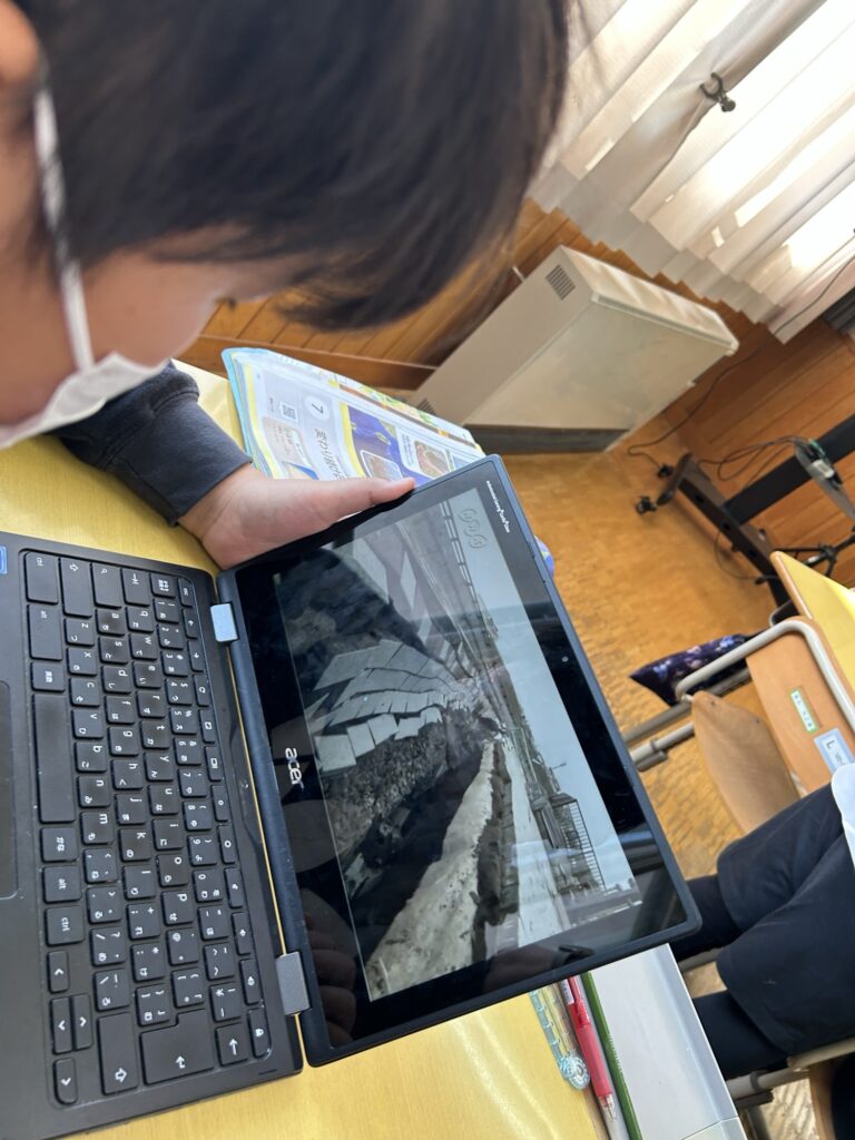 地震と火山の噴火によって大地はどう変化するのかを調べて、まとめました。教科書の写真の様子についてさらに詳しく調べるためにインターネットを活用し、見たこともない大地の様子に触れ、驚いていました。特に噴火の様子に大きく驚いていました。