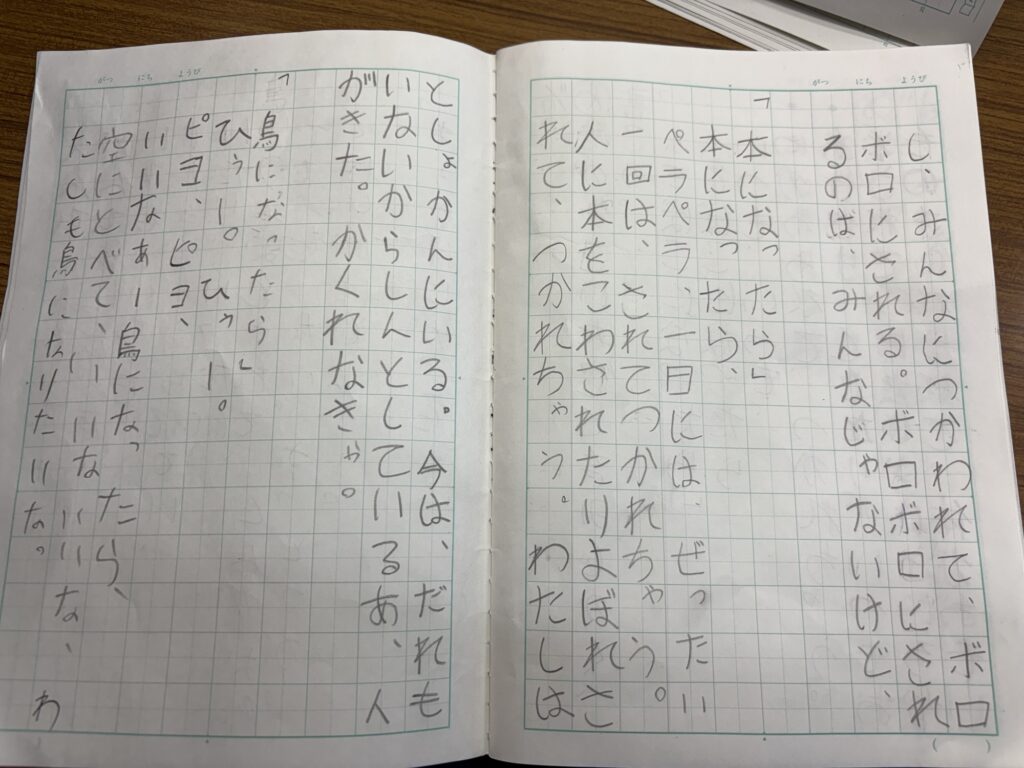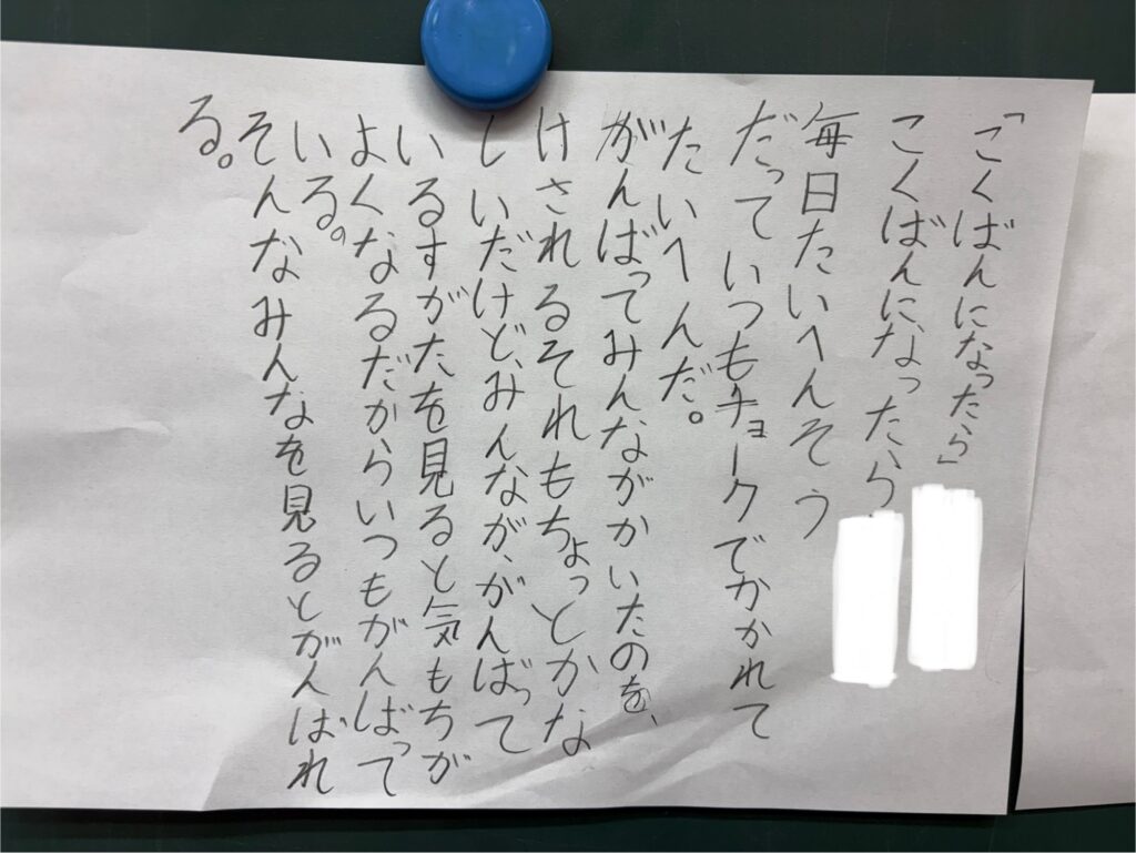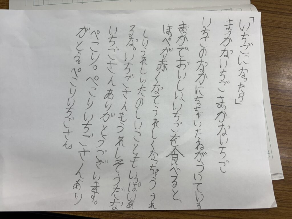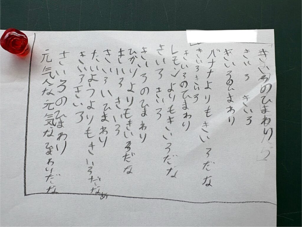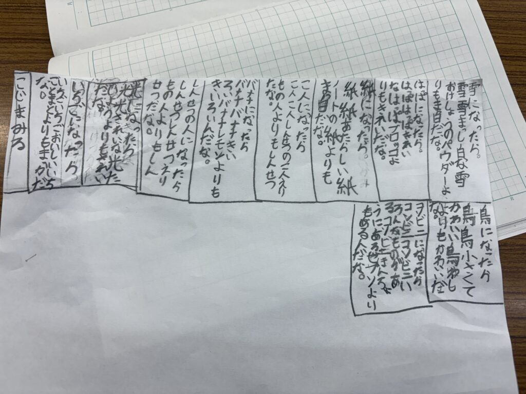 詩の学習をしています。短い言葉で心が動いた場面を思い出しながら、言葉での表現を考えていました。