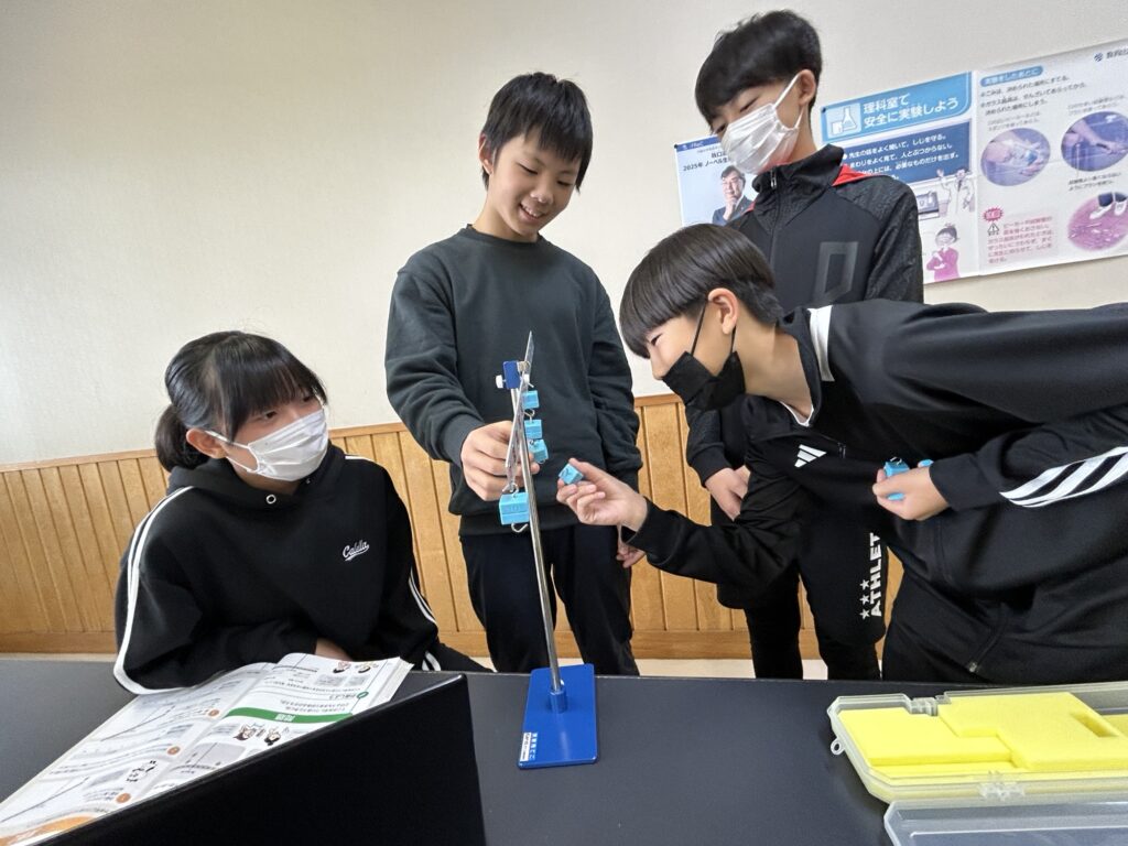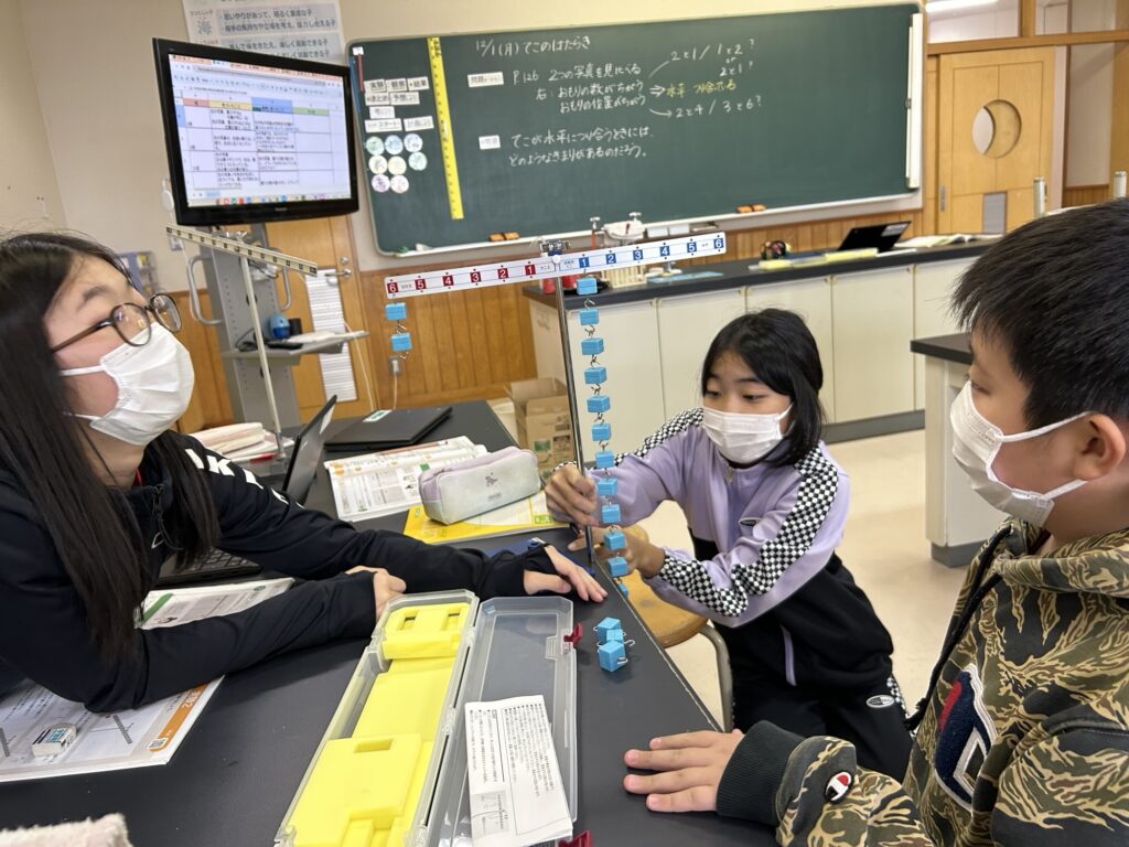 てこが水平につり合うときには、何かきまりがあるのかを調べました。調べる中で、すぐにピンと来た子もいました。
