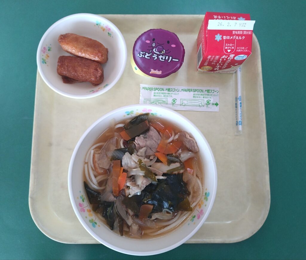 今日の給食は、五目うどん、いなり寿司、ぶどうゼリーです。