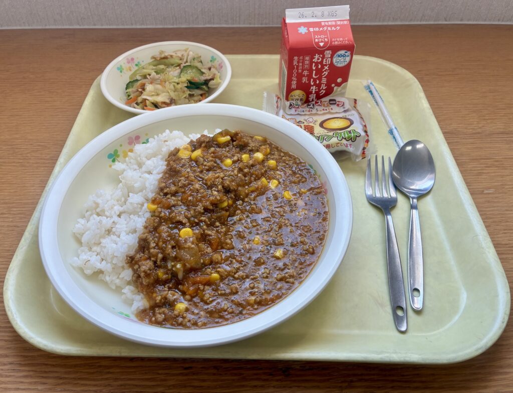 今日の給食は、ドライカレー、豚しゃぶサラダ、プリンタルト、牛乳です。