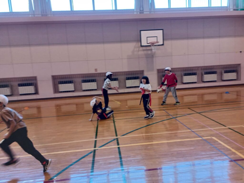 ラグビーの身体接触をなくし、タグを取り合いながら攻守交代していくスポーツです。みんな楽しく身体を動かしました。