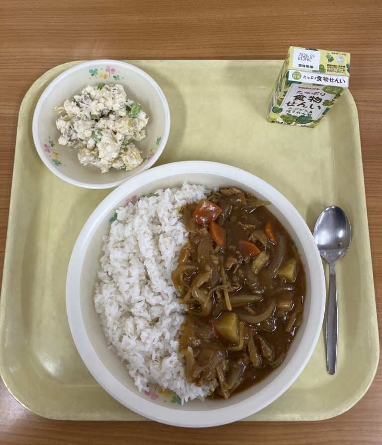 本日のメニューは、カレーライス、コロコロサラダ、ジュースです。