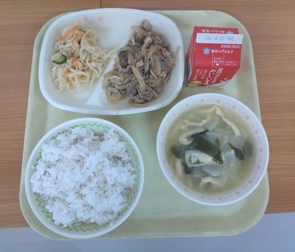 今日の給食は、ごはん、みそ汁、焼肉風炒め、甘酢和えです。